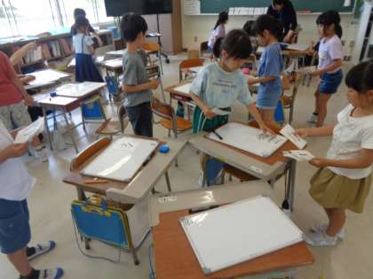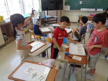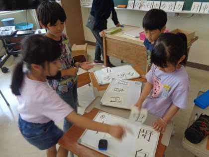 わずかに異なる「おれ」の向きに着目し、グループで話合いをしながら、漢字カードを種類分けしています。