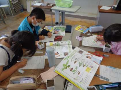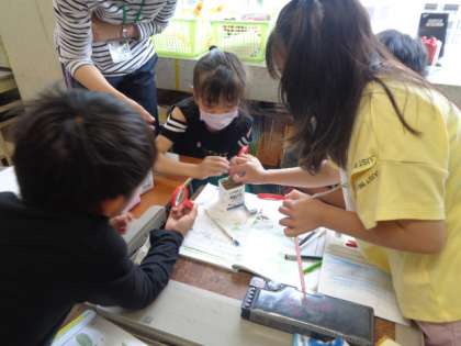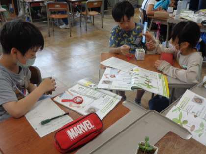牛乳パックに植えたひまわりの種の発芽の様子を観察しました。葉っぱの大きさを物差しを使って調べています。個人差があり、なかなか発芽しない種が多い原因を考え中です。