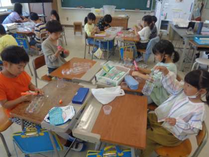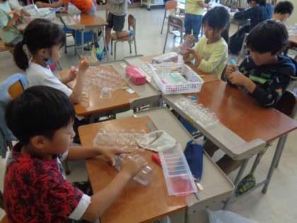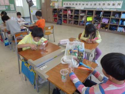 光が当たったときのイメージを考えながら、透明な容器に色をぬっています。どんな模様が映し出されるのでしょか。