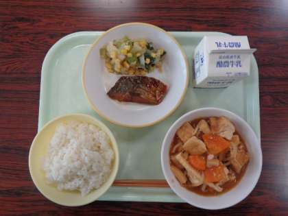 今日の献立は、ご飯 鰺のみりん焼き 厚揚げの中華煮込み チンゲンサイソテー 牛乳 でした。
