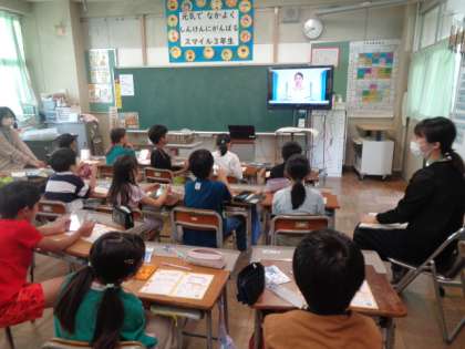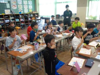 養護教諭の先生と一緒に、歯の健康について学習しました。DVDで正しい歯の磨き方を視聴後、実際に歯ブラシを使いながら確認しました。虫歯のない歯に、いつもきれいにしていきましょう。
