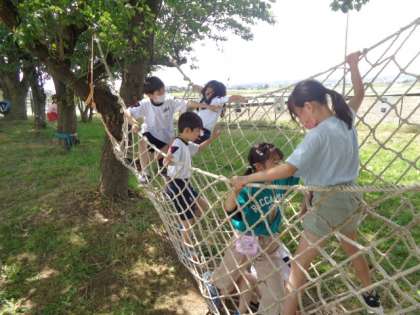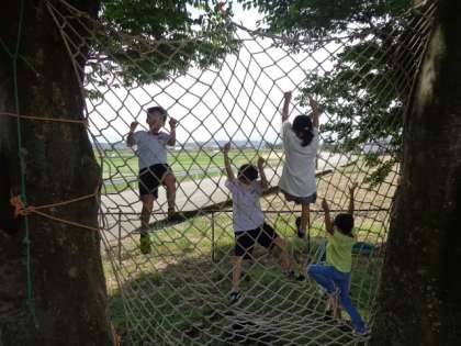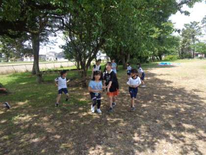 八幡の森の遊具で遊んだり、たくさんの学年の人たち仲よく鬼ごっこをしたり、サッカーをしたり、休み時間は大賑わいです。