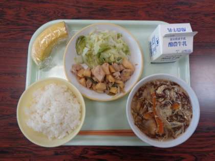今日の献立は、ご飯 卵ともずくのスープ あっさりチキン 添え野菜 バナナ 牛乳 でした。