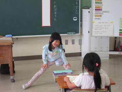 「おばさんとおばあさん」の人物になりきって、文章に合わせた動きをしました。周りの子供たちも元気な声で音読していました。