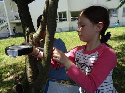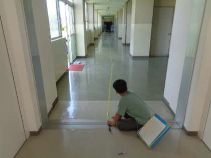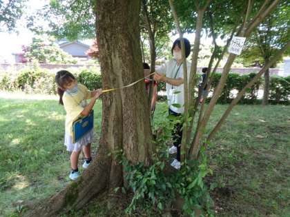 巻き尺を使っていろいろな物の長さを測っています。長い物からくねくね曲がった物まで、巻き尺だからこそ測ることのできる物を探しながら、長さを調べています。