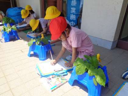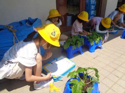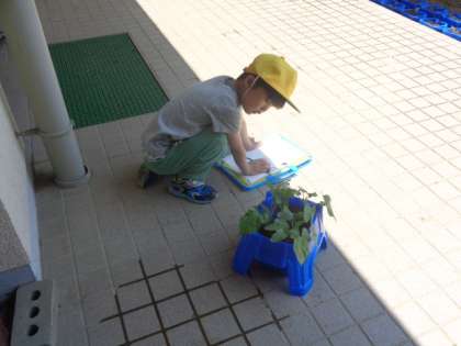 成長しているアサガオの観察をじっくりと行いました。自分の手のひらほどの大きさの葉っぱの数や様子をしかっりとまとめています。