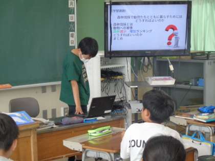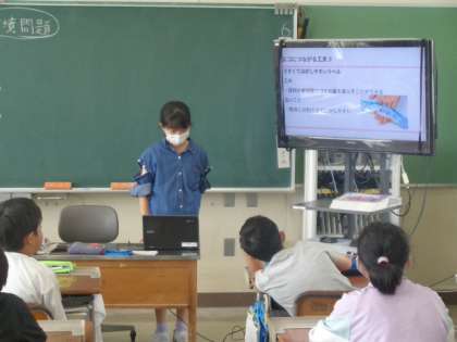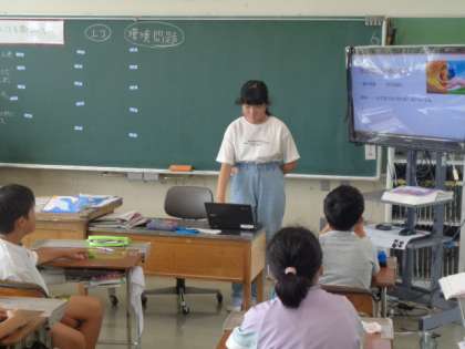 環境問題について、自分のテーマに沿って調べ、プレゼンにまとめたことを発表しています。エコ生活、海洋ゴミ、森林伐採など、テーマは多岐にわたり、事実と考えをしっかりと伝えています。