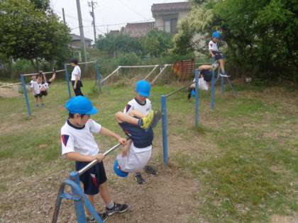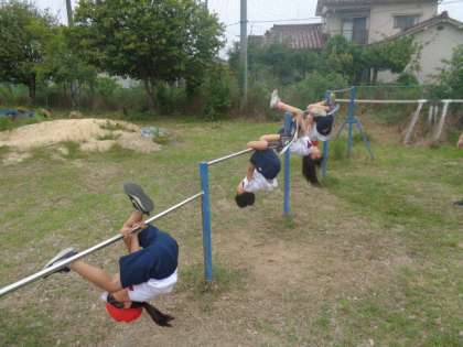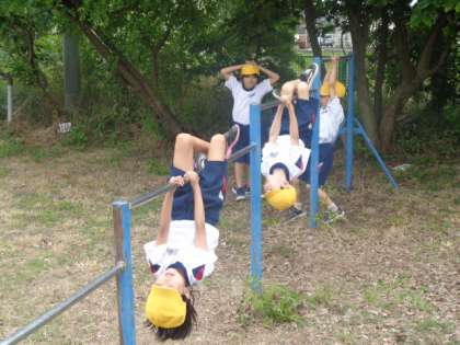 鉄棒運動で、いろいろな技に挑戦しています。「こうもり」「つばめ」「豚の丸焼き」「足かけ回り」など、できる技がどんどん増えています。