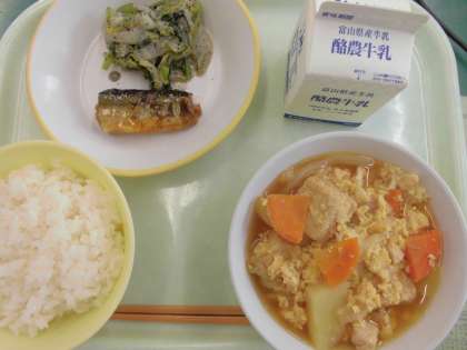 今日の給食は、さんまのマーマレード煮、よごし、卵とじ、ご飯、牛乳です。さんまの甘辛い味付けで、ご飯が進みます。
