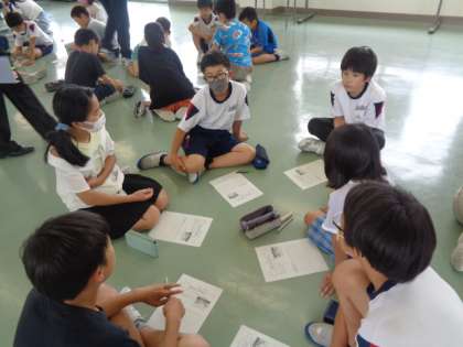 4〜6年生が合同で、「落ちているゴミを見付けた時にどうか」について話し合いました。「自分が捨てたゴミなら」「汚いゴミは拾えないな」「拾う気分がよいよ」グループや全体での話合いを通して、自分の考えを振り返っていました。
