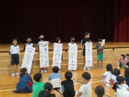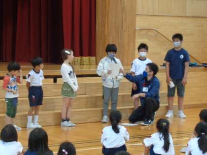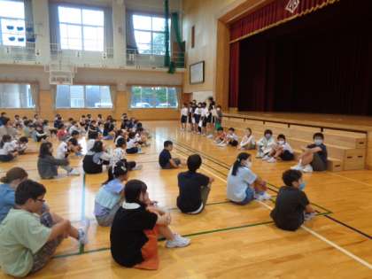 あいにくの天候のため、プール開きは体育館で行われました。各学年の代表の人たちが水泳学習の目当てを発表した後、運動委員の人たちがプールの決まりで大切な「はひふへほ」を発表しました。いよいよ水泳学習が始まります。早くも来週の天気が気になる子供たちです。
