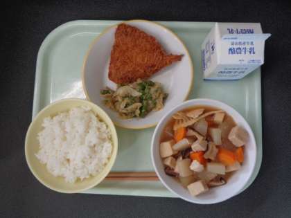 今日の献立は、 ご飯 高野豆腐と冬瓜の煮物 鰺フライ グリーンアスパラのごまだれ 牛乳 でした。
