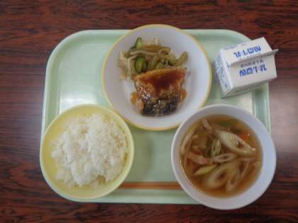 今日の献立は、 ご飯  魚の梅風味蒲焼き  根菜スープ  茎わかめの中華和え  牛乳  でした。