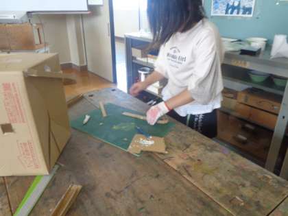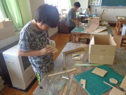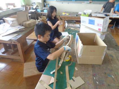 ビー玉が転がるレール作りに夢中です。イメージがどんどん広がっていきます。