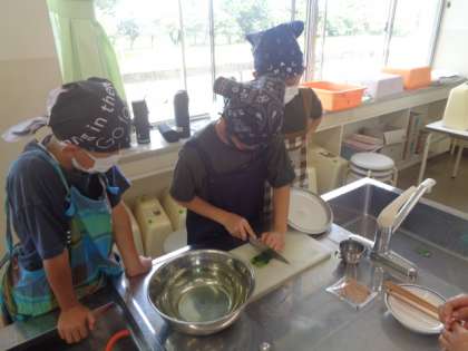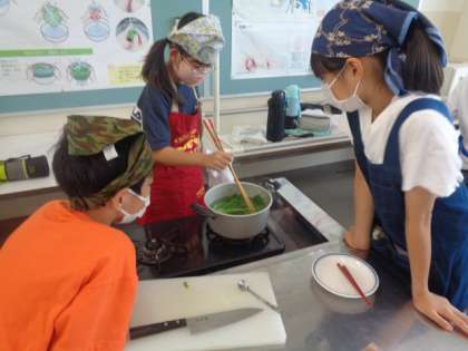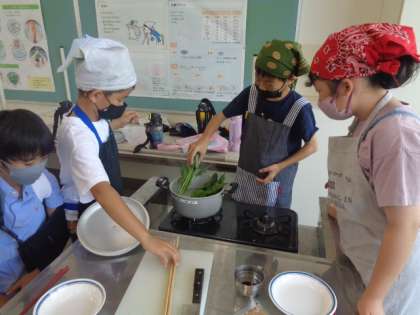 うく初めての調理実習。ほうれん草をゆでて、おひたしを作っています。ゆで時間を計り、「猫の手」で包丁で切っています。出来上がりはどうだったでしょうか