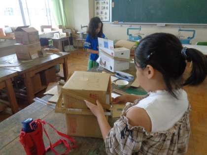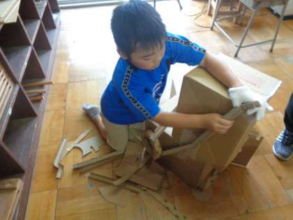 レールのパーツを組み合わせ、玉が転がる世界をアイディアいっぱいに広げ創作しています。