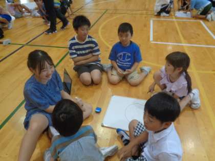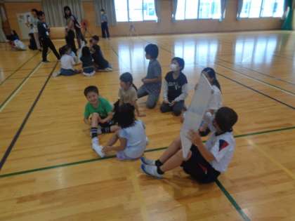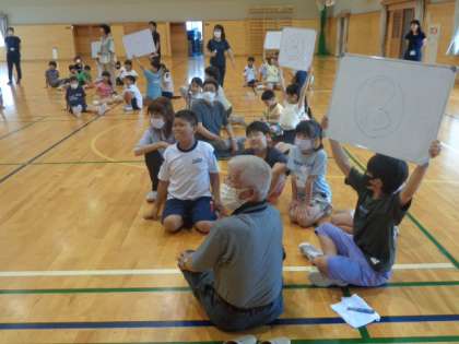 6年生が企画運営をし、七夕集会を開きました。畑や稲作作りでお世話になっている地域の方をお招きし、七夕にまつわるクイズで楽しみました。