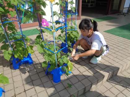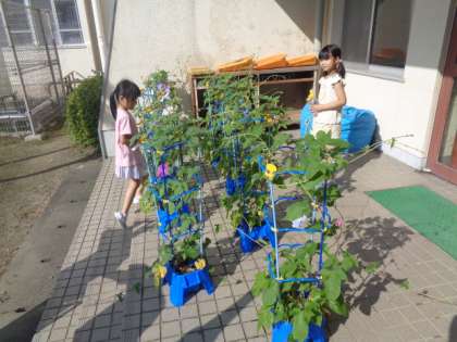 色とりどりのアサガオの花が咲き始め、玄関で出迎えてくれます。。