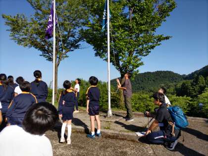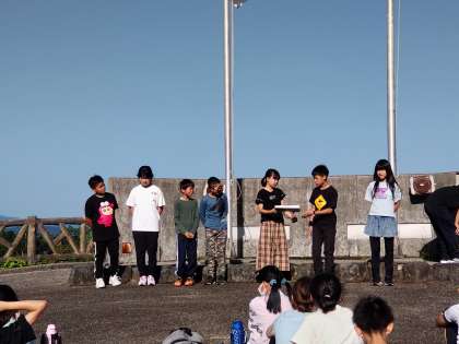 宿泊学習の2日目。気持ちのよい天気です。朝のつどいでは、活動紹介をしたりラジオ体操をしたりしました。