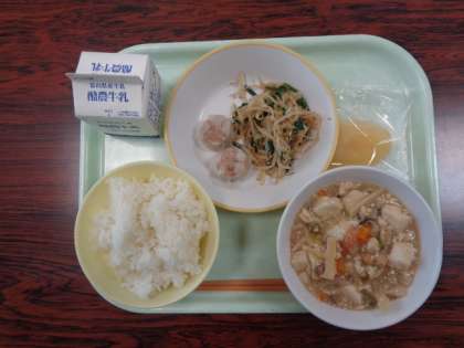 今日の献立は、ご飯  えびと豆腐のうま煮  肉シューマイ  ナムル  冷凍りんご  牛乳  でした。