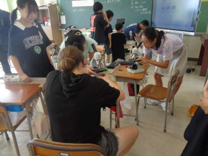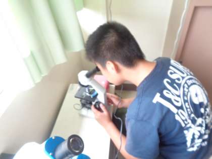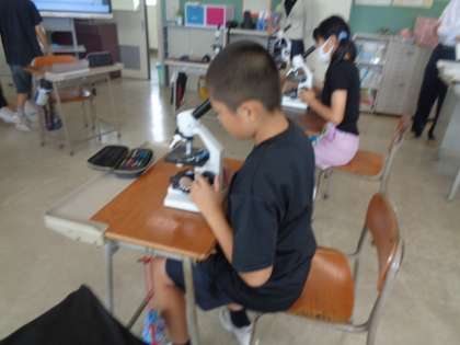 顕微鏡を正しく扱いながら、水中の微生物を見付けています。