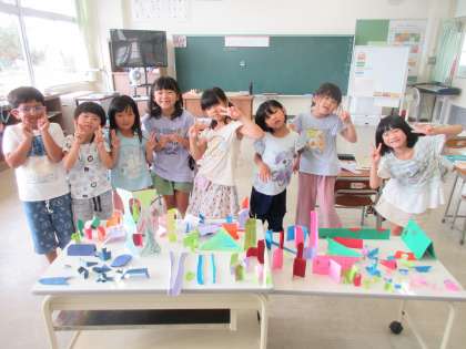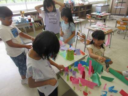 色画用紙を立つように折って、いろいろな物に見立てながら作品を完成させました。最後は、みんなの作品を合体させて町を作りました。それぞれストーリーを思い浮かべながら楽しく活動しました。