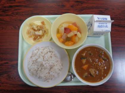 今日の献立は、麦ご飯 夏野菜カレー フルーツカクテル 福しん漬け 牛乳 ですた。