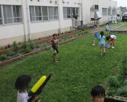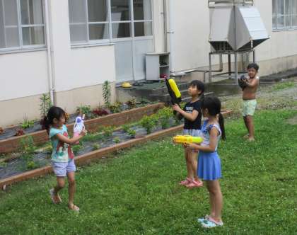 生活科で水遊びをしました。お互いの水鉄砲を貸し合いながら使い、楽しく活動しました。