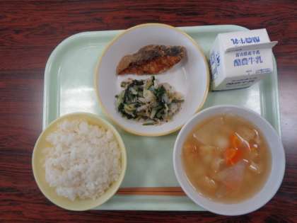 今日の献立は、ご飯  白玉汁  魚の竜田揚げ  梅肉和え  牛乳  でした。