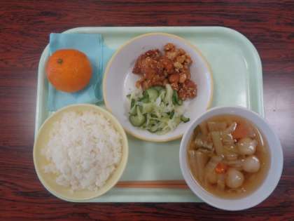 今日の献立は、ご飯 豚肉と大豆の甘味噌からめ つみれ汁 きざみ和え 冷凍みかん 牛乳 でした。