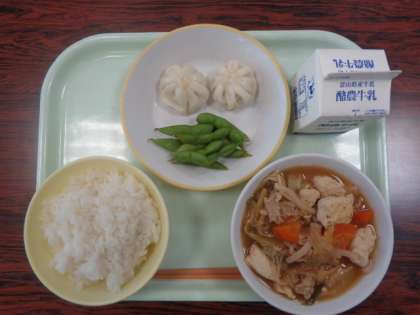 1学期最後の給食となりました。献立は、ご飯 韓国風すき焼き えびパオツ 枝豆 牛乳 でした。 調理員の皆さん、美味しい給食、ありがとうございました。