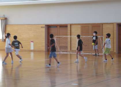 始めは、「体を動かそうスポーツ会社」からの出し物で「ハンドボール」をしました。体育で少し学習したことがある程度でしたが、少人数のグループだったので、みんなが一生懸命動いていました。