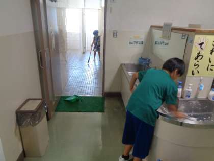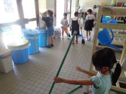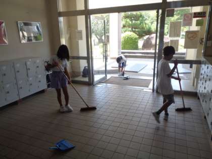 じりじりとした暑さを感じながらのなかよし班掃除。進んで掃除を行いました。