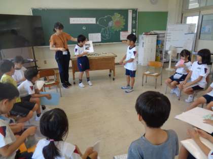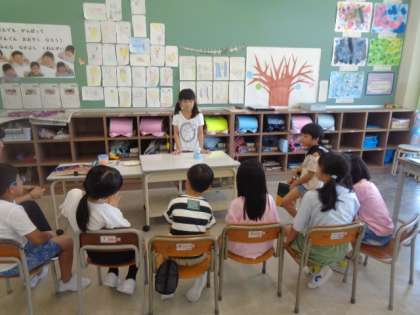 夏休みの作品を紹介し合っています。全校で同じ内容のものが一つも無く、どの作品も趣向を凝らしたものばかりでした。