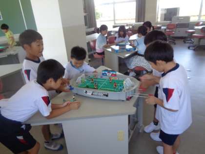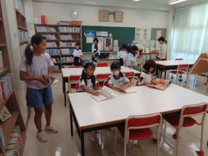 休憩中、熱中症指数のレベルに合わせた過ごし方を確認しながら活動しています。エアコンの効いた図書室やコンピュータ室での活動も人気です。
