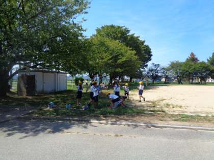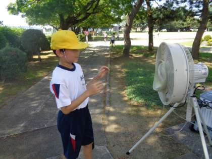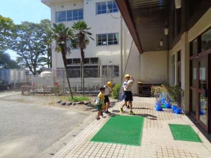 グラウンドや児童玄関にミストシャーも登場。体を休めるための少しゆとりをもった行動も大切です。