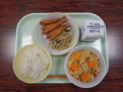 2学期の給食が始まりました。今日の献立は、ご飯 高野豆腐の卵とじ わかさぎのフリッター 香味和え 牛乳 でした。今日は調理員さんからのプレゼントで、おかずの中には、花型の人参も入っていました。とても美味しくいただきました。