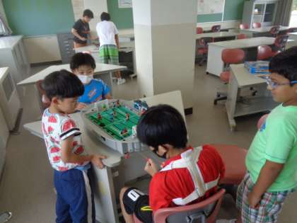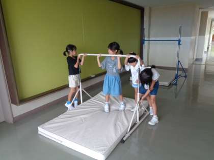 今日の熱中症指数計は10時で27。昨日より低く、警戒レベルですが気温は高い状態です。気温に応じた過ごし方の放送後、自分対の判断で遊ぶ子供たちです。