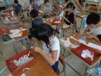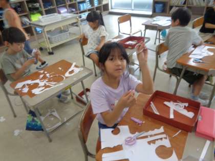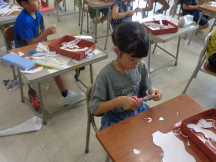 はさみを使って紙をいろいろな切り方の試しをしながら切っています。どんな模様ができあがるのかな。