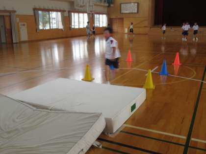 体育科では、マットを使って走り幅跳びの練習をしています。踏切時の3歩を意識したり、滞空時間を長くする跳び方を意識したりするなど汗だくになりながら練習していました。