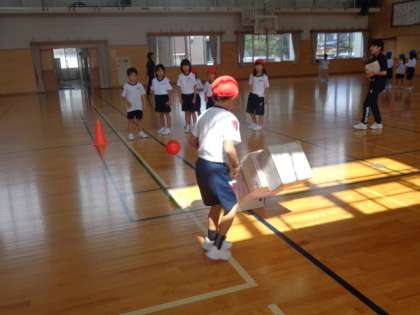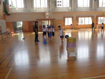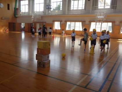 ボールを正確に蹴って、積み上げた段ボールを落とすゲームをしています。「すごい」「ナイス」など、温かな声援も交わされ、グループで楽しみながら運動に取り組んでいます。