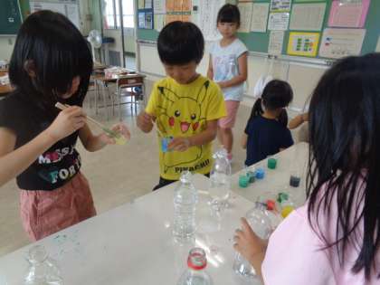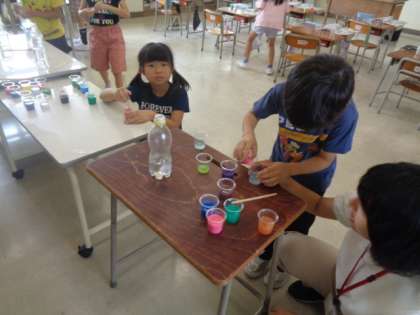 いろいろな色の絵の具を使って、色水を作っています。たくさんの色水が作り出されていました。