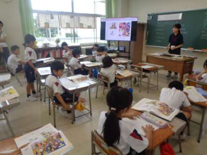 教育実習生の先生と道徳科の授業です。自分たちの住む「まち」のよさについて考えています。