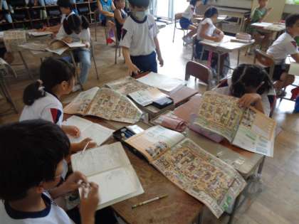 スーパーマーケットでは、どのような仕事があるのか、イラストを参考にして考えています。