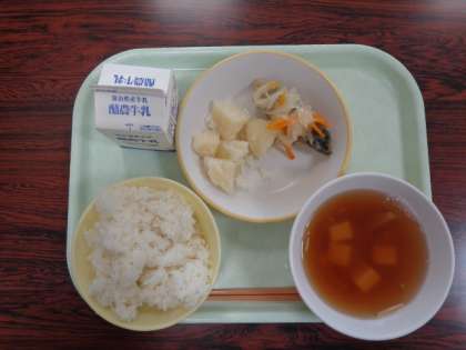今日の献立は、ご飯  ふくらぎのマリネ すまし汁  こふきいも  牛乳  でした。