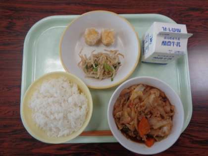 今日の献立は、ご飯 回鍋肉 人参しゅうまい 塩ナムル 牛乳 でした。
