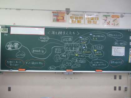 関わっている人を黒板にたくさん書きました。それらの人がどのように関わり、どのような思いを抱いているのかを考えました。