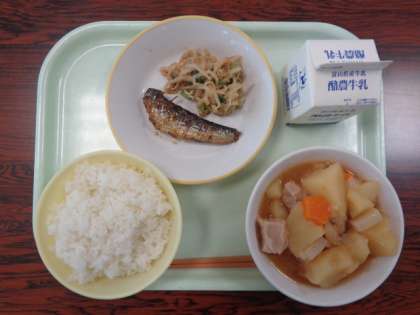 今日の献立は、ご飯 豚肉とジャガイモの南蛮煮 鰯の土佐煮 ごま和え 牛乳 でした。