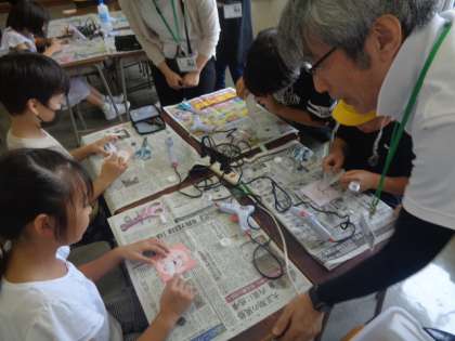 3・4年生は、磁石に付く砂鉄の性質を生かしたおもちゃ作りです。磁力に引きつけられながら変化する砂鉄の動きや模様に見入ってしましました。