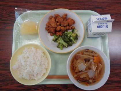 今日の献立は、ご飯 鶏肉とひよこ豆の甘からめ 沢煮椀 ゆでブロッコリー 冷凍りんご 牛乳 でした。